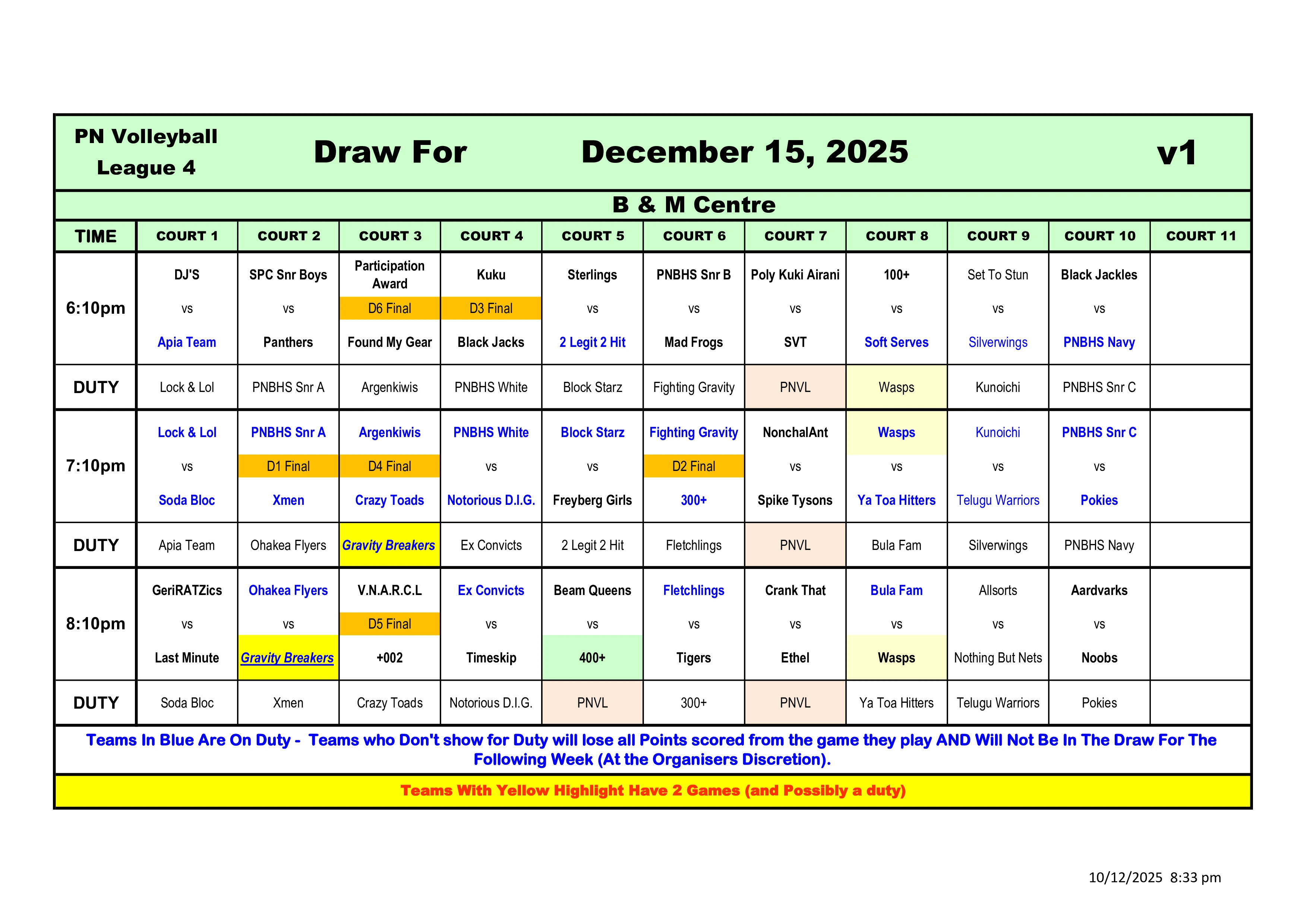 Teams on Duty are required to have 2 referees. Failure to do so will result in loss of referee point.